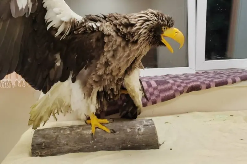 Как уточнили в авиакомпании, орлана Георгия нашли в начале августа в Магаданской области, в устье реки Армань, с перебитым крылом. По словам очевидцев, орлан сидел неподвижно на берегу реки и не реагировал на приближение людей. В ветклинике птице сделали рентген, который показал перелом левого крыла — такая травма в дикой природе почти всегда приводит к гибели.