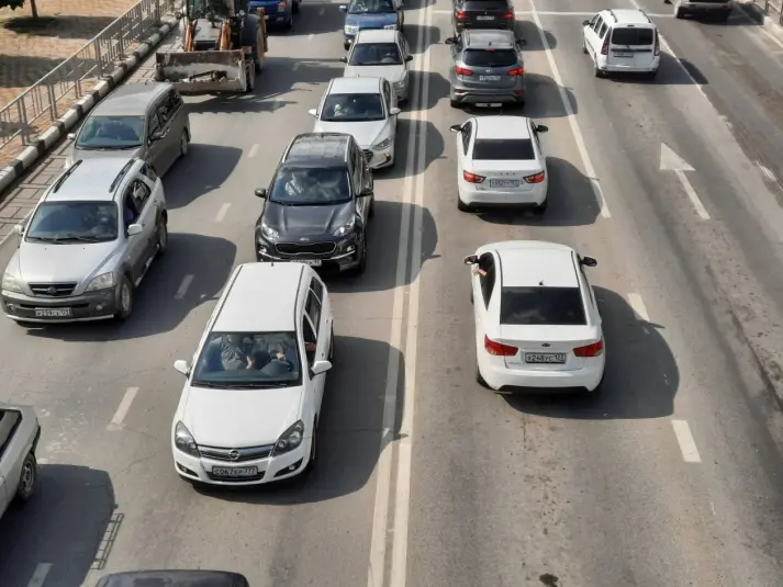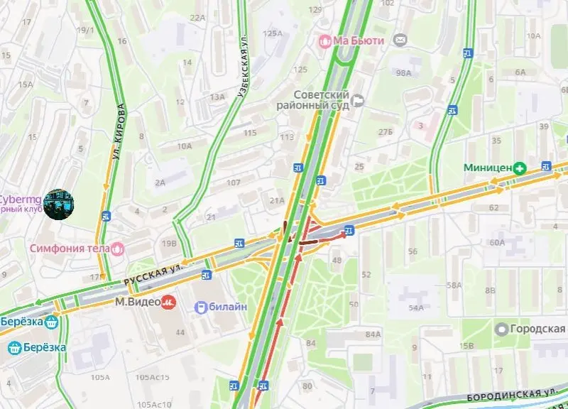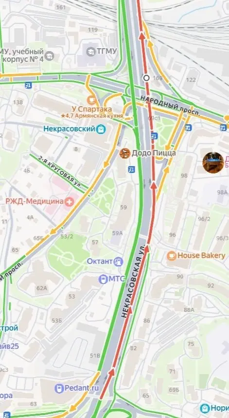 Пробка в сторону перекрёстка начинается ещё с заезда на Некрасовский путепровод. Дорожный затор растянулся почти на четыре километра.
