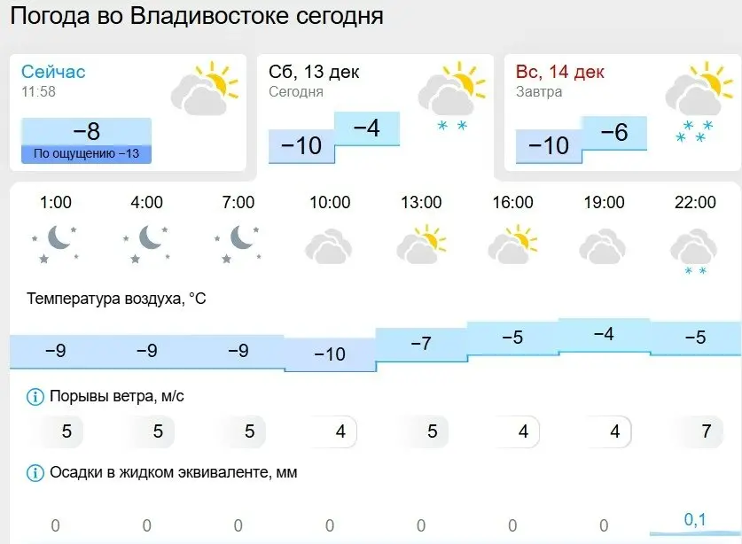 Ранее синоптики предупреждали жителей Владивостока о мощном снегопаде с субботы, 13 декабря, на воскресенье, 14 декабря. Ожидалось, что город накроют обильные осадки, которые осложнят движение и работу транспорта. Однако свежие прогнозы показывают, что сценарий немного меняется.