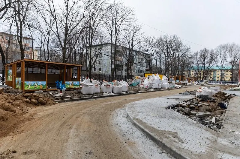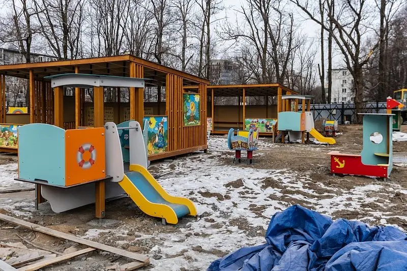 На территории детского сада уже смонтированы игровые площадки и теневые навесы, выполнено асфальтирование территории, территория огорожена новым забором. Параллельно рабочие укладывают брусчатку, а также обустраивают подъезд к детскому саду.