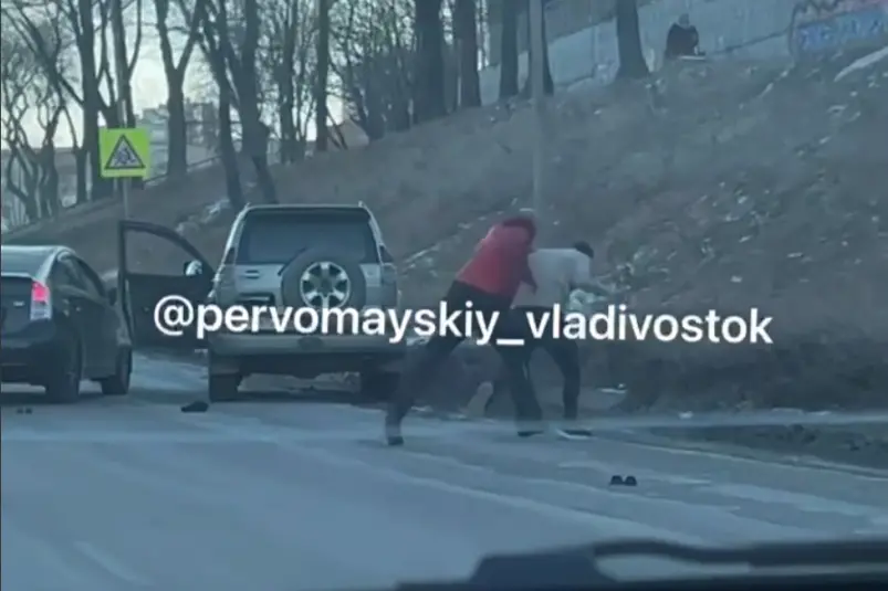 Двое водителей устроили настоящую битву посреди проезжей части во Владивостоке. Конфликт произошел в районе улицы Запорожская, недалеко от светофора.