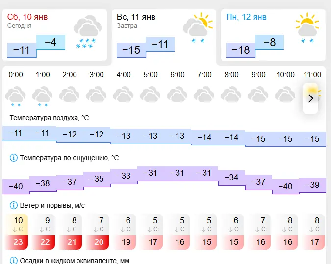 Прогноз на 11 января остаётся напряжённым. Ночью температура составит около –15 °C, днём –11 °C. Снегопады продолжатся, местами сохранятся метели и сильный ветер. Лишь к вечеру 11 января ожидается прекращение осадков и постепенное улучшение погоды.