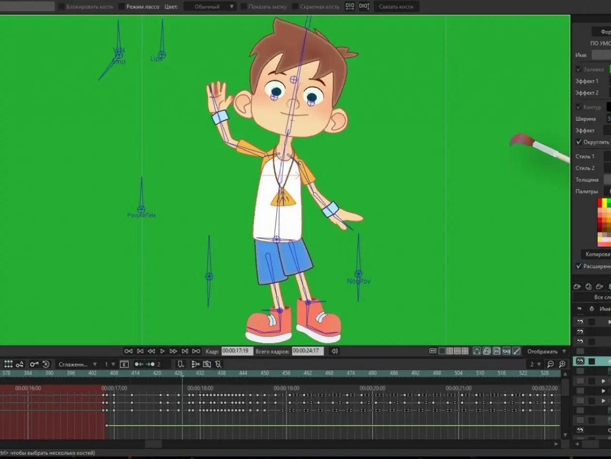 Перед тем как к проекту приступают аниматоры, подключаются специалисты по риггингу (триггеры). Они превращают нарисованного персонажа в "куклу": накладывают виртуальный скелет, задают кости и деформеры.