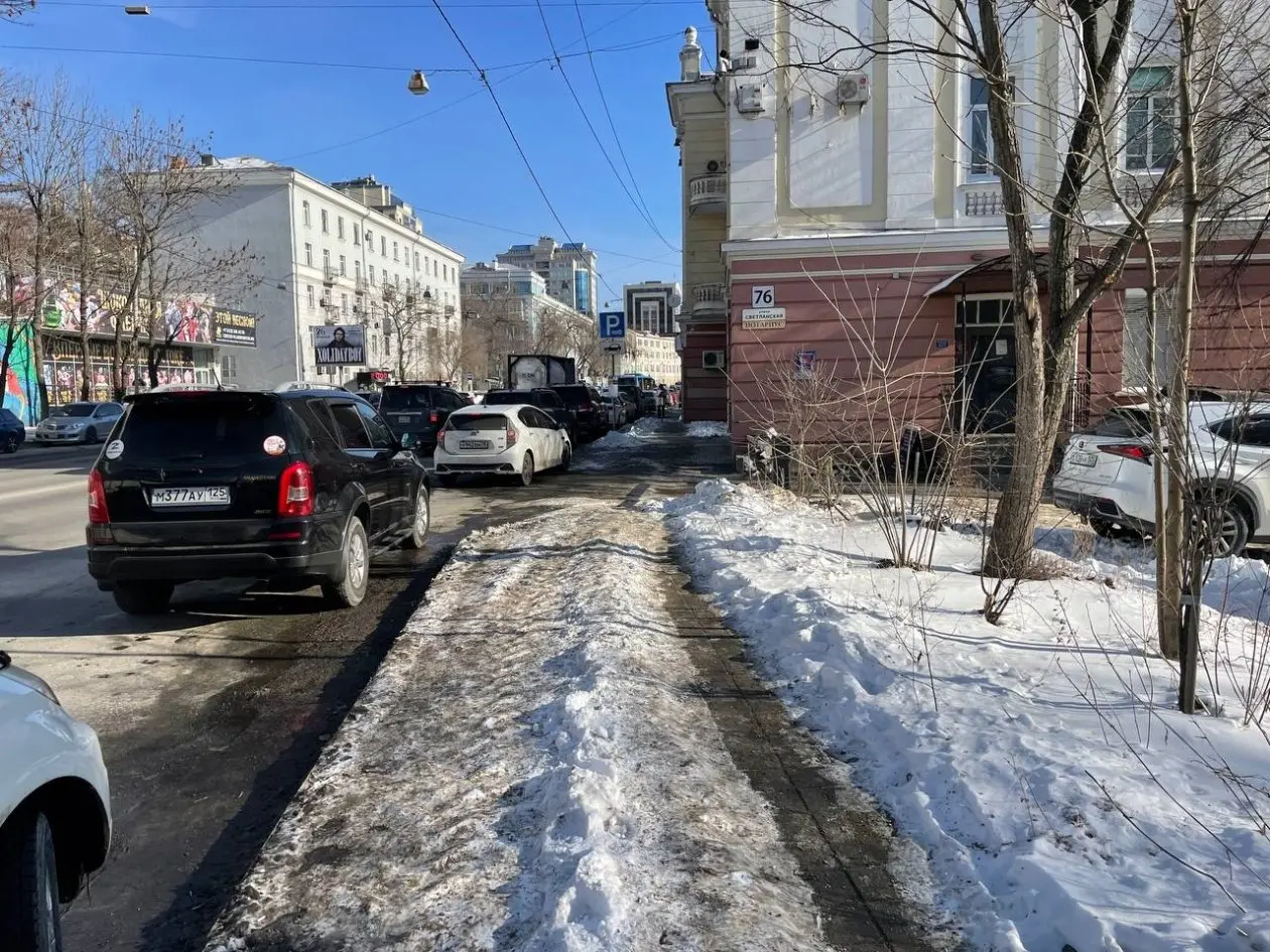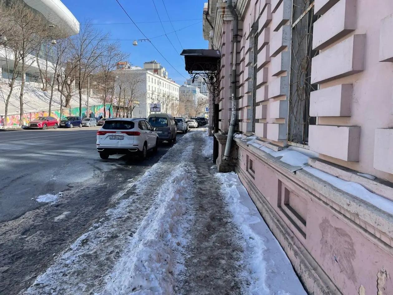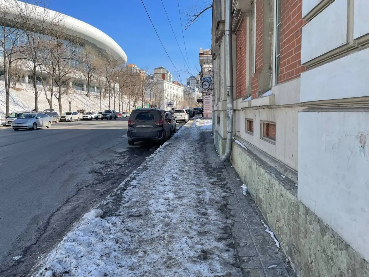 Очищенный тротуар возле дома №85 по улице Светланской. Фото: ИА PrimaMedia