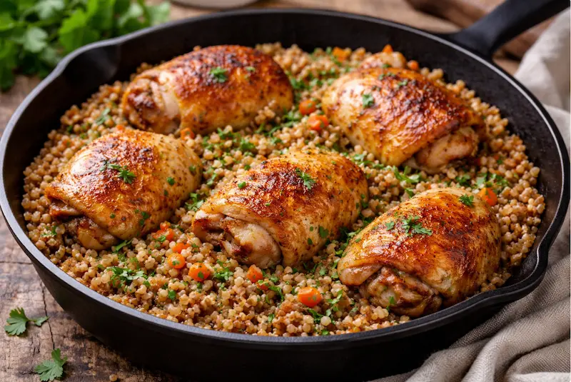 400 г гречки и куриные бедра – вкусный и полезный ужин на одной сковороде