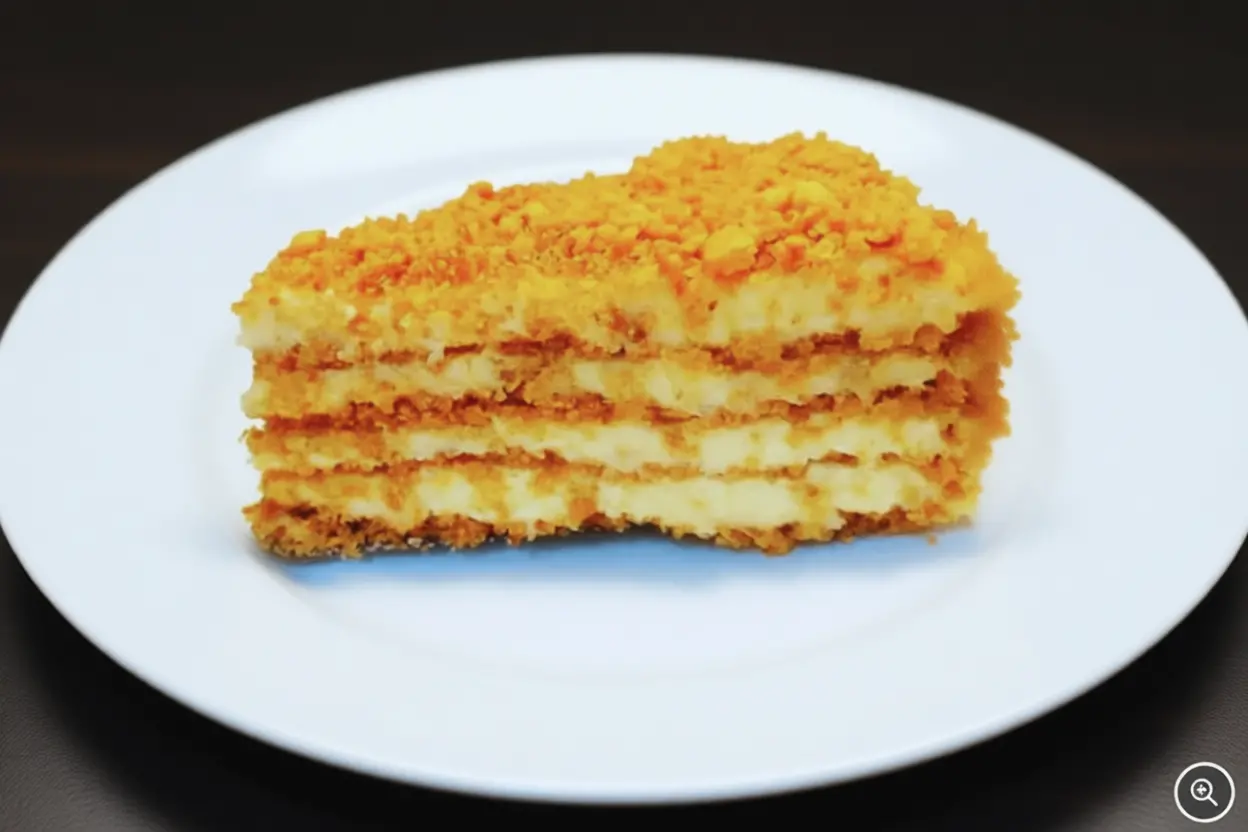 Яйца — 2 шт, Сахар — 150 г, Соль — щепотка, Ванильный сахар — 10 г, Сливочное масло — 50 г, Сметана — 500 г, Кукурузный крахмал — 2 ст. л. Приготовление: Просеять муку в миску, добавить соль, ванильный сахар и сахар. Вмешать холодное масло, перетереть до мелкой крошки. Выложить на сухую сковороду, обжаривать на среднем огне, постоянно помешивая, до золотистого цвета и ароматной рассыпчатости. Для крема смешать яйца, сахар, соль, ванильный сахар, сметану, крахмал и масло. Варить на среднем огне, помешивая, пока смесь не загустеет. Крем должен быть гладким и шелковистым. В разъемную форму 20 см застелить пергамент, выложить слой крошки, смазать кремом, затем снова крошку, чередовать слои. Верхний слой — крошка. Охладить в холодильнике 4–5 часов для пропитки.Перед подачей можно украсить сахарной пудрой или орехами.