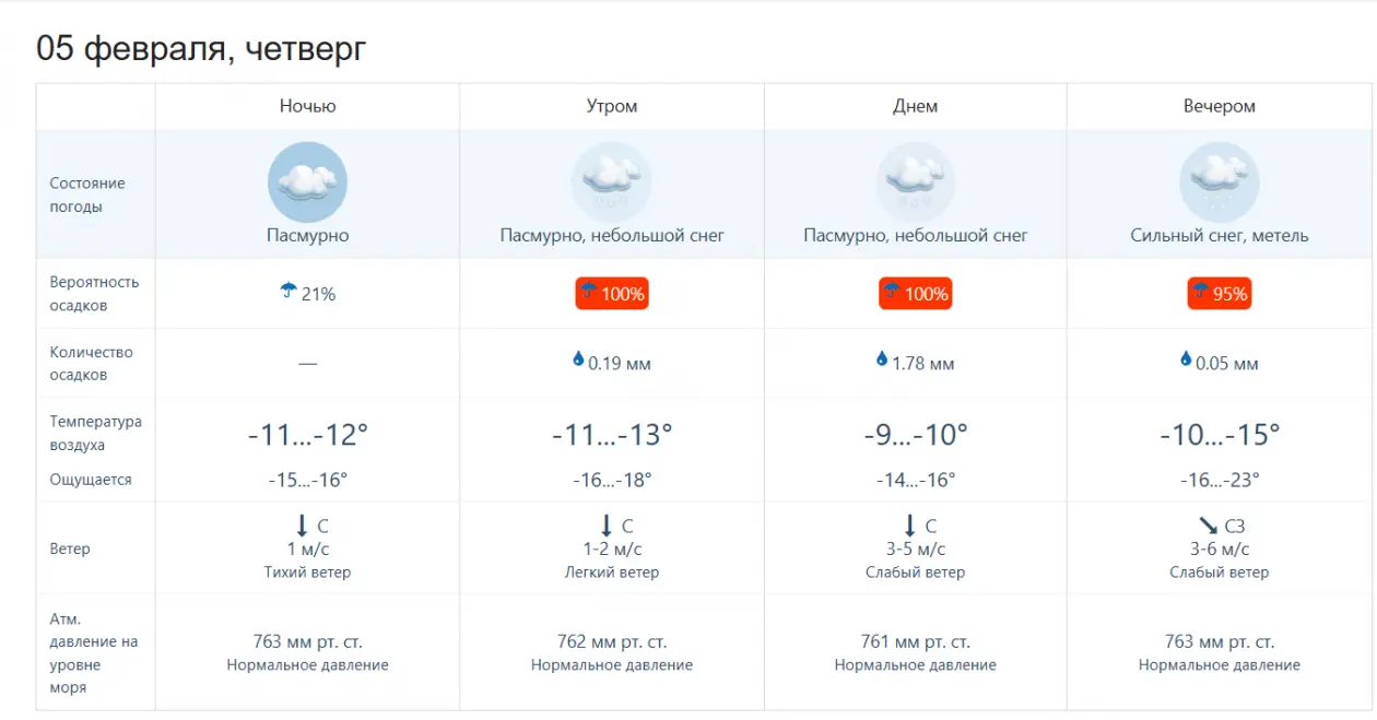 Погода резко ухудшится в четверг, 5 февраля. Согласно метеосводке сайта "Примпогода" (12+), утром в Уссурийске начнется несильный снег при температуре воздуха в -13°C и легком ветре. Небольшой снег будет сыпать на протяжении всего дня, градус вырастет до -9°C, ветер усилится.