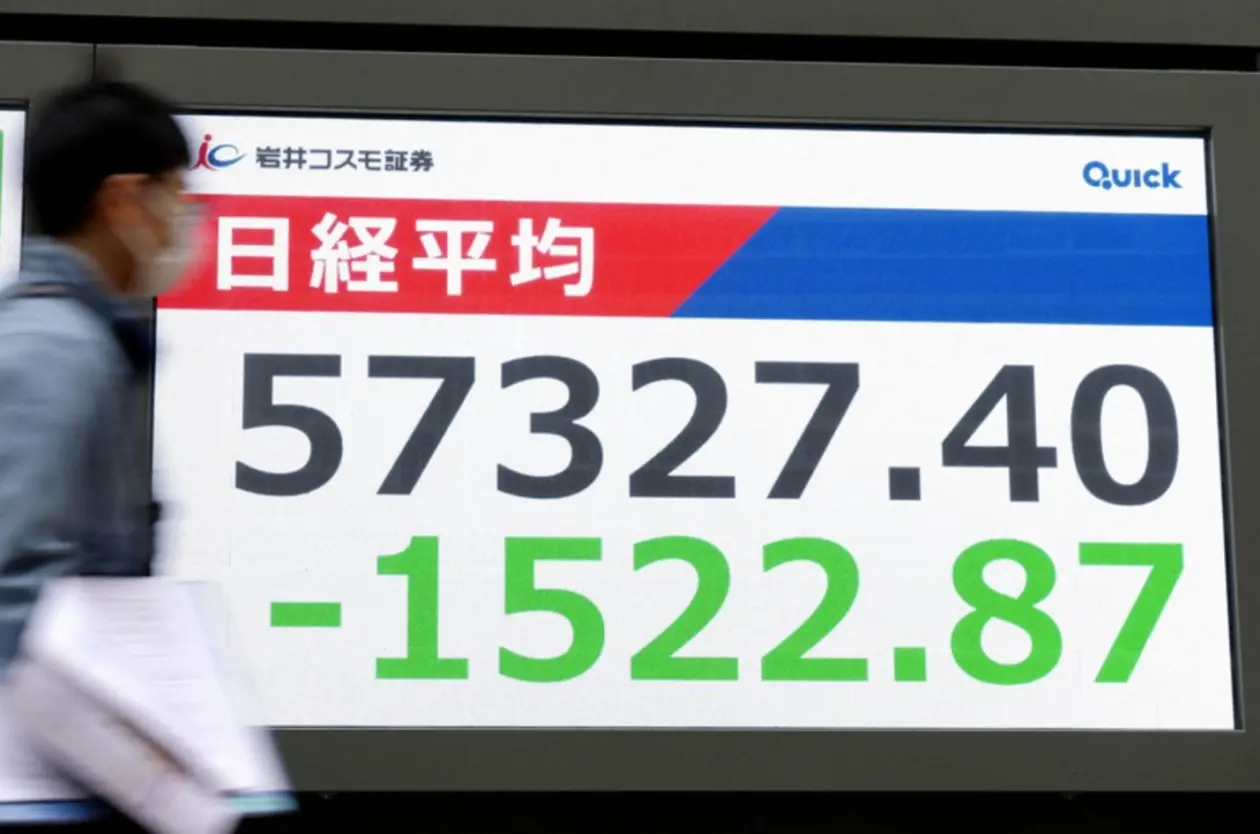 На экране в Токио отображаются финансовые данные, показывающие падение фондового индекса Nikkei более чем на 1500 пунктов во время утренних торгов 2 марта. Фото: Kyodo