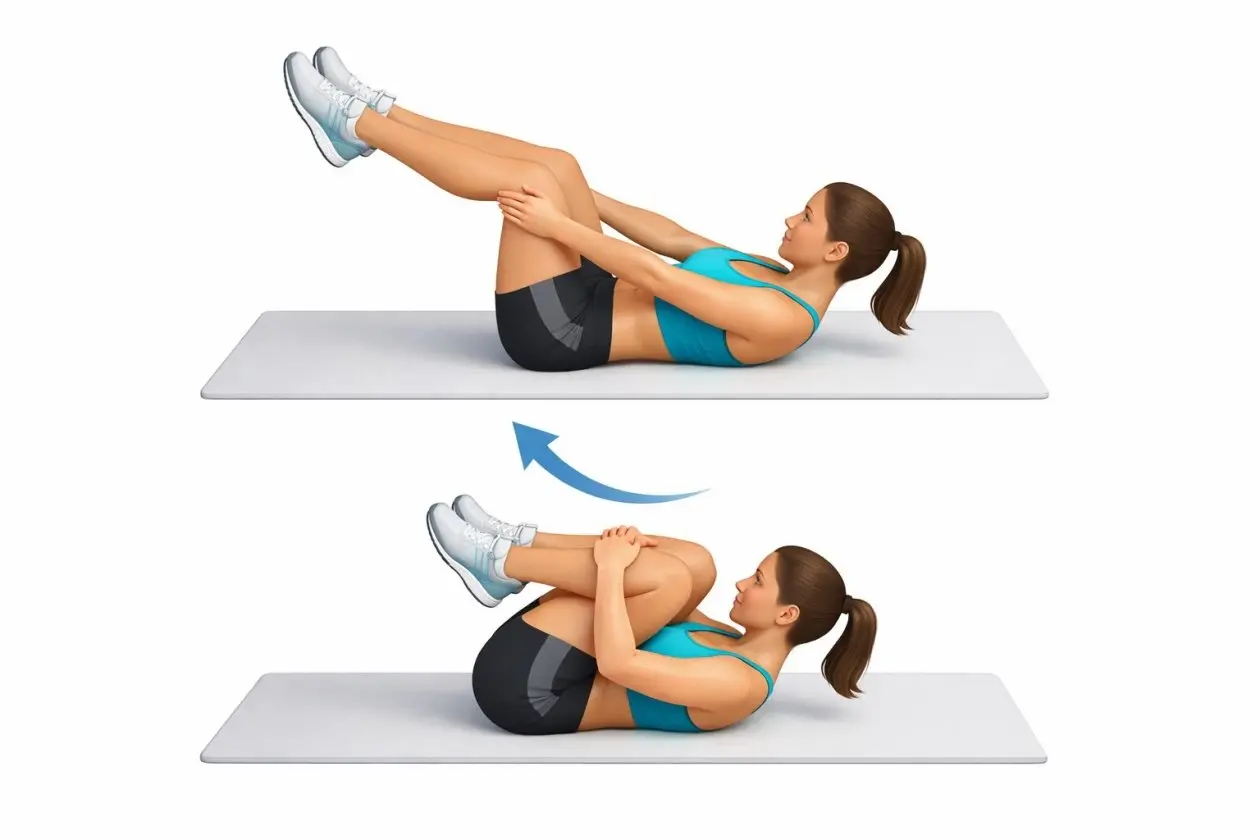 Техника выполнения шаг за шагом Лягте на спину и полностью расслабьте тело. Согните ноги в коленях и подтяните их к груди, обхватив руками голени. На выдохе медленно выпрямляйте руки и ноги, поднимая их примерно на 45 градусов от пола. В этот момент важно слегка напрячь пресс и прижать поясницу к полу. На вдохе плавно вернитесь в исходное положение, снова подтягивая колени к груди. Движение выполняется спокойно и без резких рывков. Продолжайте выполнять упражнение в течение одной минуты.Техника важнее скорости: держите пресс в тонусе, а спину прижатой к полу.