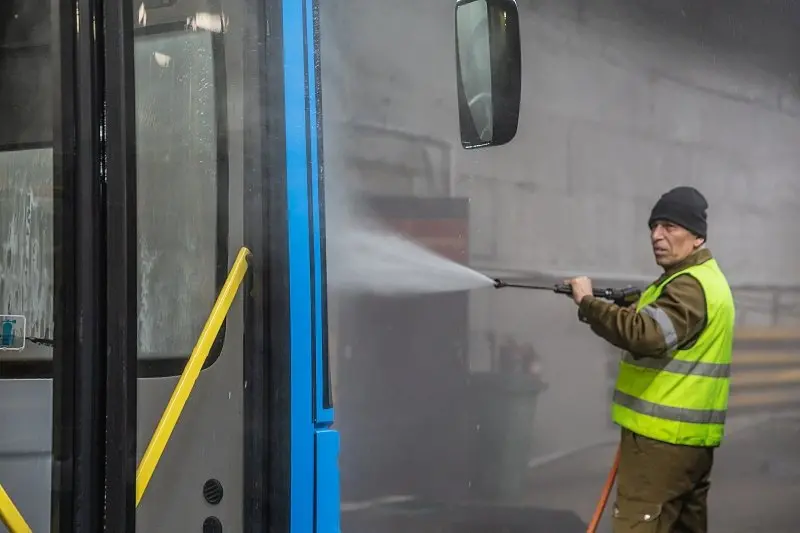 Процесс начинается с внешней мойки. Сначала кузов очищают вручную под высоким давлением, затем наносят специальный состав для растворения грязи и соляных отложений, после чего автобус проходит через полуавтоматическую моечную установку. Затем происходит уборка салона: компактные аппараты чистят полы, а сотрудники обрабатывают каждую деталь — от пластиковых панелей до стекол.