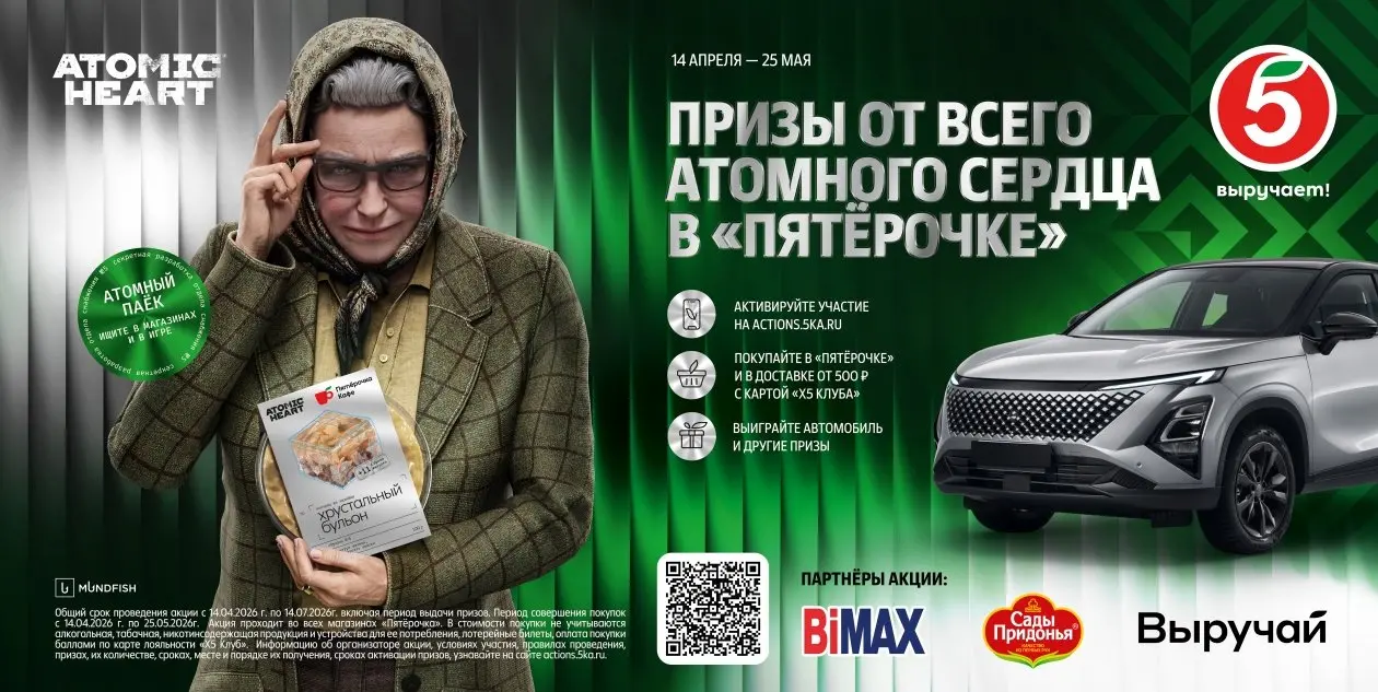 PrimaMedia, 20 апреля. С 14 апреля по 25 мая торговая сеть "Пятёрочка" проводит федеральную акцию "Призы от всего Атомного сердца в Пятёрочке" в коллаборации с видеоигрой Atomic Heart (18+), приуроченную к выходу нового дополнения к популярной игре (DLC 4). Покупатели получат фиджитал-опыт: эксклюзивные новинки собственных брендов "Пятёрочки" появились не только на полках, но и в игре, а привычные походы за продуктами дадут шанс выиграть автомобиль и другие призы.